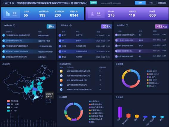 本次双选会参会单位55家,共提供职位数203个,设置招聘人数达6344人。涉及单位以武汉为主,此外还包括来自北京、广东、上海、陕西等多个省/市,提供包含软件工程师、无人机航测工程师、遥感技术工程师以及辅导老师等多种岗位。参与本次空中双选会的学生不仅有必赢官网学生,还有本校其他学院和其他高校的学生,共报名275人,当日到场209人,在线面试412人次;共计投递简历116人,投递简历量606份,其中本校学生报名人数118人,投递简历量534份,占比88.12%。