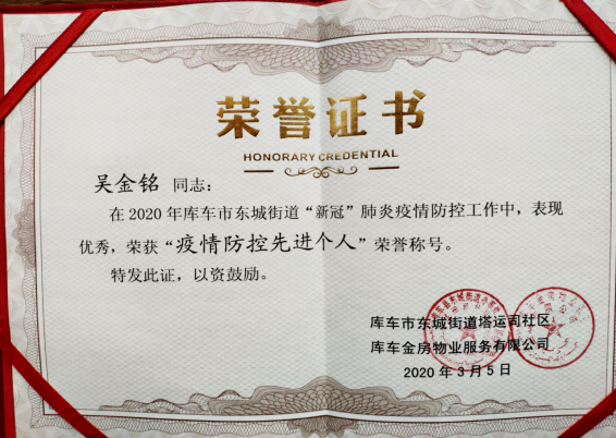“忙碌到凌晨是常有的事”吴金铭说,“社区居民都很配合我们的工作,虽然民族不同,但我们是手足情深的同胞,大家相处很融洽。居民对我们表达的感谢、安慰和鼓励,是我们志愿者努力工作的动力。”直到现在,吴金铭仍然每天在防疫工作站,帮助居民办理出入证、协助相关机构办理健康码、统计进疆人员与返疆人员信息等。他用自己的细心、耐心和责任心做好每一项工作,由于在疫情防控工作中表现突出,他被评为“疫情防控先进个人”。
