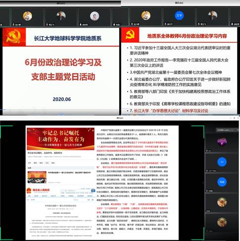 2020年6月18日下午,必赢242net官网地质系全体教师通过腾讯会议形式开展集中政治理论学习、支部主题党日活动以及地质系教研活动。