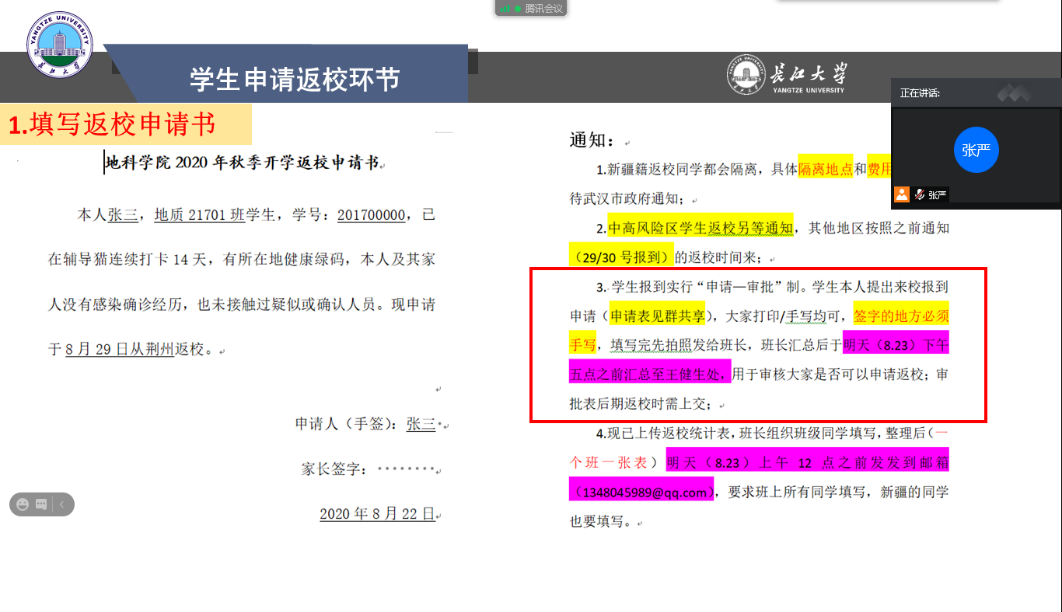 8月22日,必赢官网分年级利用腾讯会议或雨课堂召开“2020年秋季开学工作”主题班会,会议由各年级辅导员主持,学工办全体老师参会。主题班会开始前,各年级辅导员先以班级为单位,进行点名和签到,确保所有学生和家长到会。主题班会从返校安排、返校前的准备、报到流程、校园管控三阶段和学费缴纳五个方面展开。各年级辅导员为大家重点讲解了分批返校和校园管控三阶段的具体安排,强调了返校前必须的14天连续健康打和按流程返校,并将“申请—审批”制度的具体做法向学生进行了说明。班会最后,各年级辅导员分别就同学们提出的问题或疑惑一一进行了解答。学生和家长纷纷表示本次班会让大家更加全面了解到学校和学院的整体防控工作,也明确了返校前后需要做的准备,是非常必要的会议。