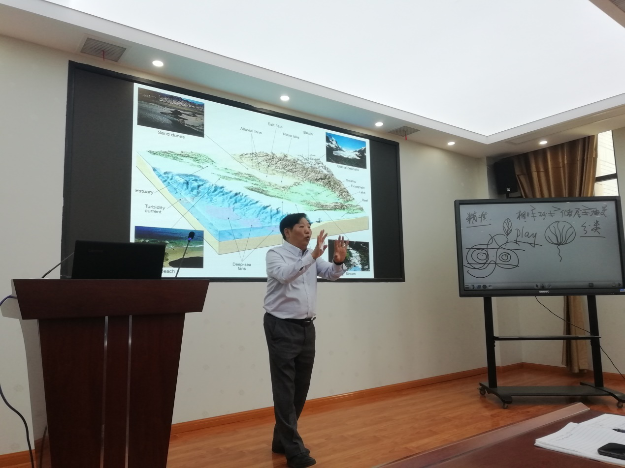 讲座正式开始,于教授给所有人提出了八大沉积地质学问题,这种开题的方式,着实新颖,紧紧抓住了台下每一位师生的注意力。于老师通过简单的现象,引发学生以系统地质思维思考常见的地质现象,这是日常课堂中难以学习到的。于教授结合几十年的科研、生产与教学经验,以碎屑岩沉积相为讲授主题,以成因为主导,系统介绍了如何对碎屑岩沉积相进行系统研究,具体介绍了:岩心观察的科学方法、井震结合划分层序、小层对比原则、平面沉积相图编制方法等。通过具体案例分析,于教授总结出了若干条地学哲学思维并分享给大家,如科学证据是基础、地质模式为导向、微观向宏观分析、宏观向微观思维、现象描述为外延、成因分析为内涵,这些深刻的哲学思维引发了在座师生的强烈反响,为我们今后的学习与科研提供了思想指导。