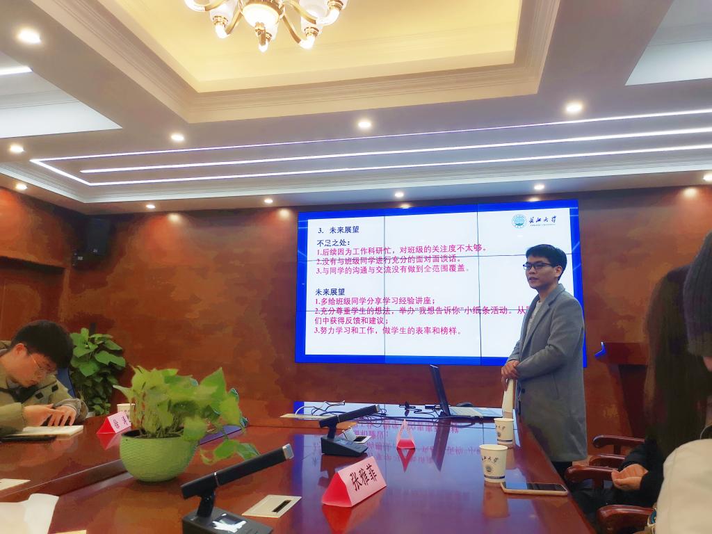 在简短的自我介绍后,地物学院三位嘉宾分别分享自己带班的经验体会,讲述了送诊发热学生、找高年级新疆籍学生帮助新生老乡更好的适应本地气候等问题的事例,及对“班导、班委配合”等方面的思考。随后必赢官网班导依次上台,通过PPT用数据、图文生动展示了新生入学以来的学习、生活情况以及班导们在引领团学工作、班级团建、学风建设等方面的特色方法,包括每天发布“军训日记”、利用班团会为班内同学庆祝生日加强班级凝聚力、用“群作业”功能收集截图保证青年大学习完成率、自编地学知识小测验提高学习积极性、坚持陪伴早晚自习将学风渗透在言行举止中……各种别出心裁的做法让大家在交流中,有了新办法,新收获。分享后班导们就自己工作中的问题,积极提问交流,直到九点半还意犹未尽。