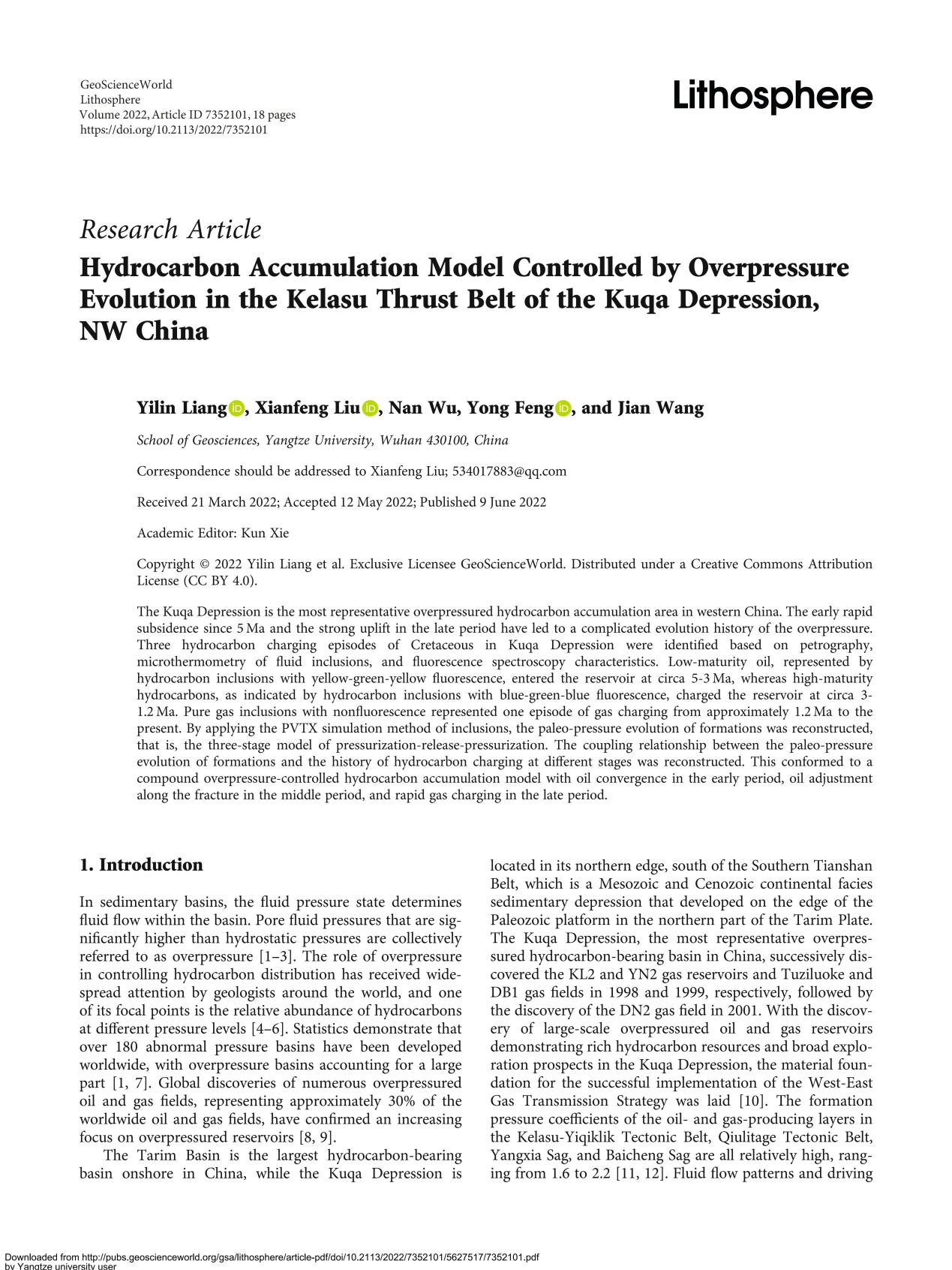 地科学院博士生梁祎琳在《LITHOSPHERE》上发表题为“Hydrocarbon Accumulation Model Controlled by Overpressure Evolution in the Kelasu Thrust Belt of the Kuqa Depression, NW China”的研究论文。必赢242net官网为论文第一署名单位,博士生梁祎琳为论文第一作者,教师刘显凤为通讯作者。